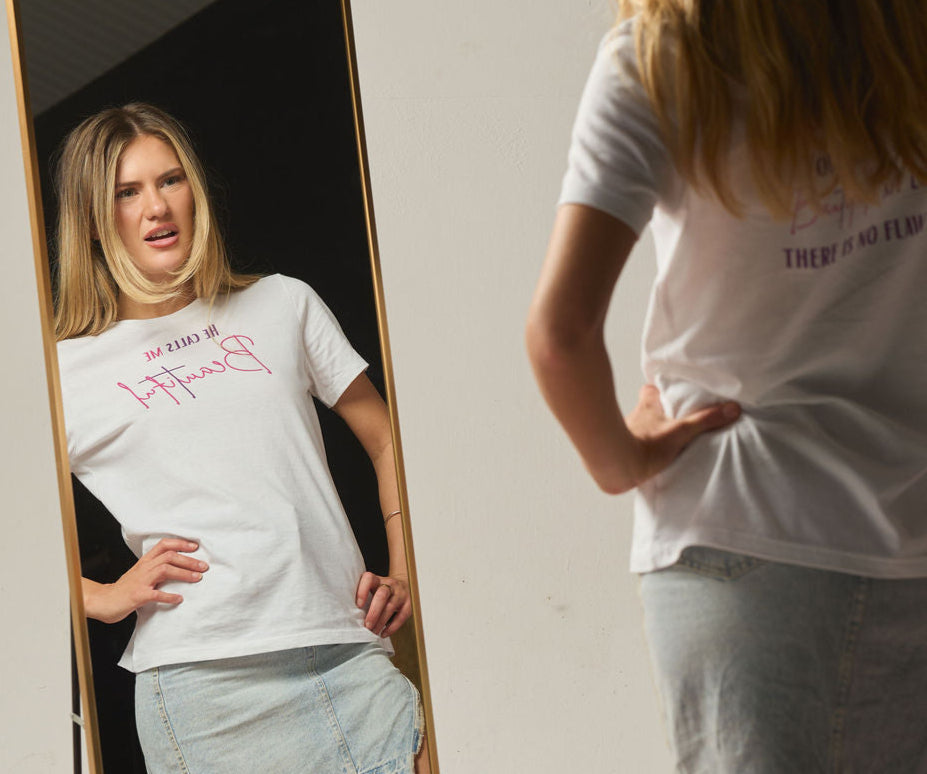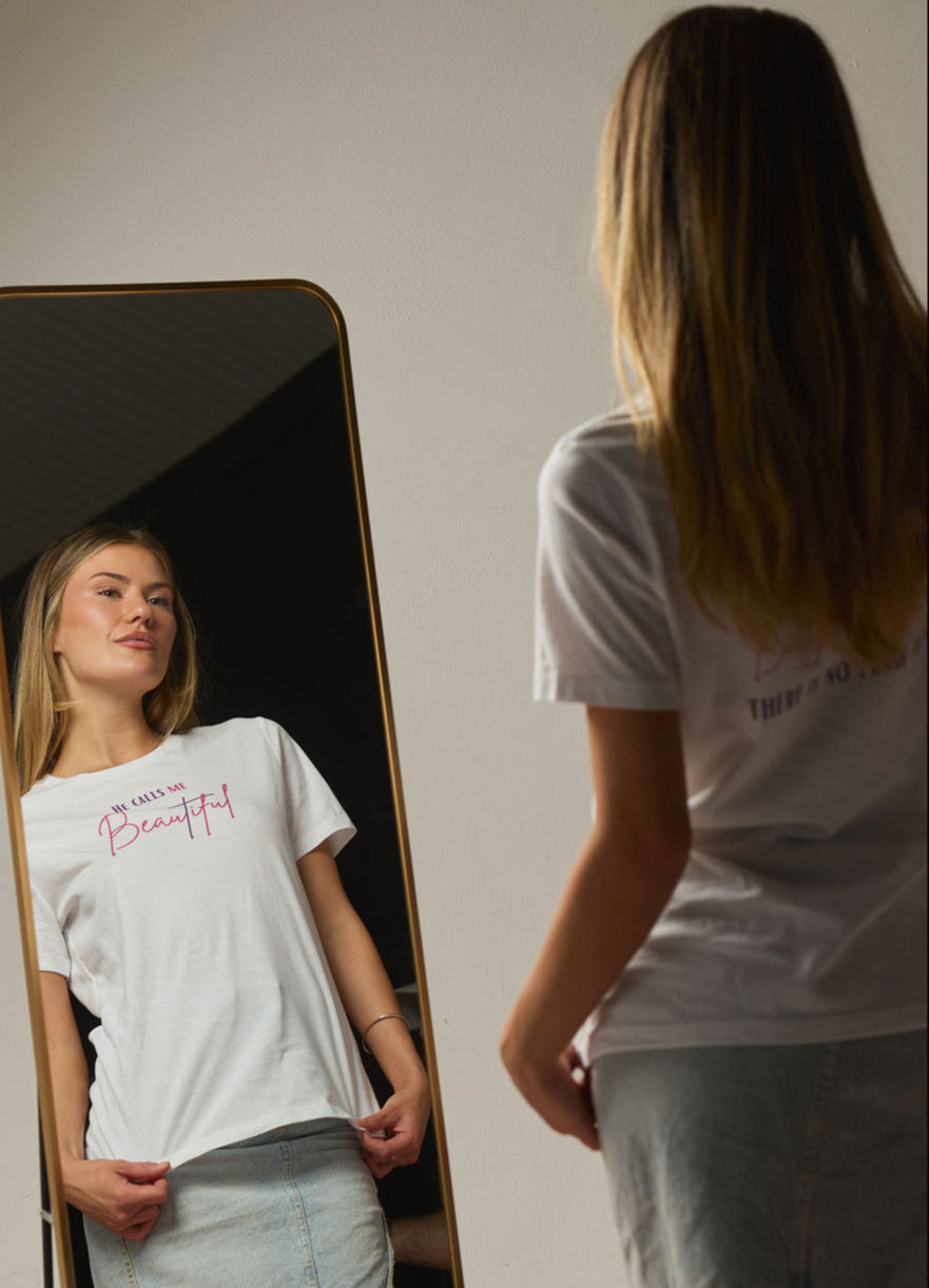 He Calls Me Beautiful Reverse Print White Tee — Mirror-Readable Design